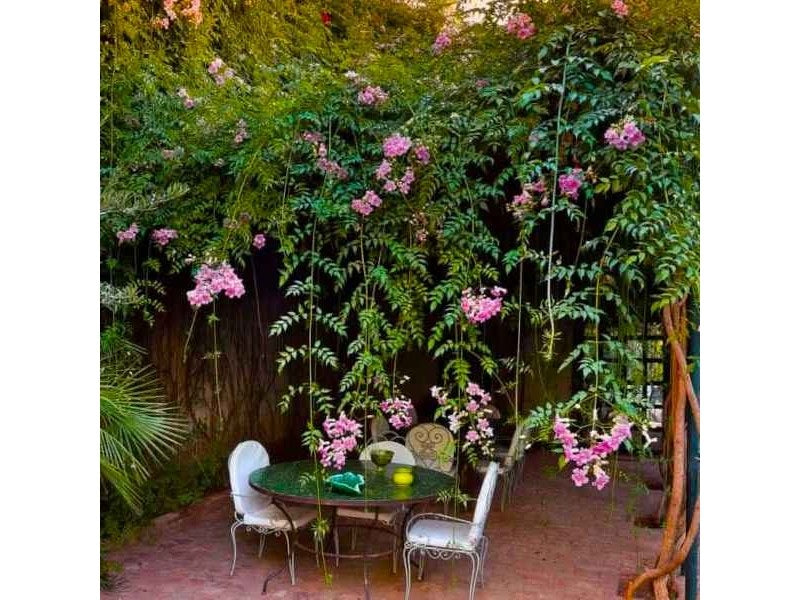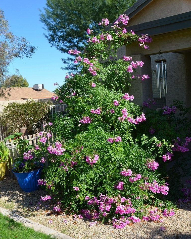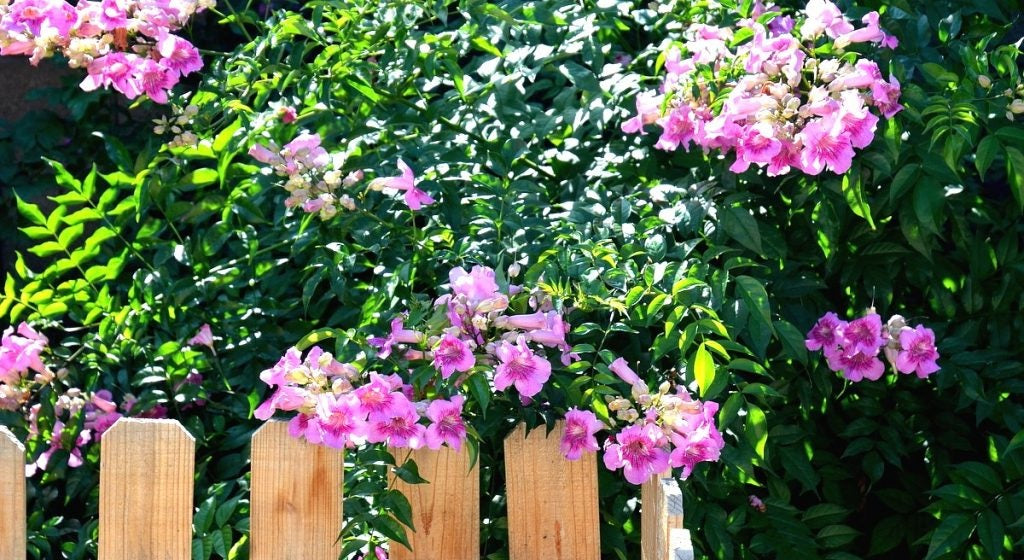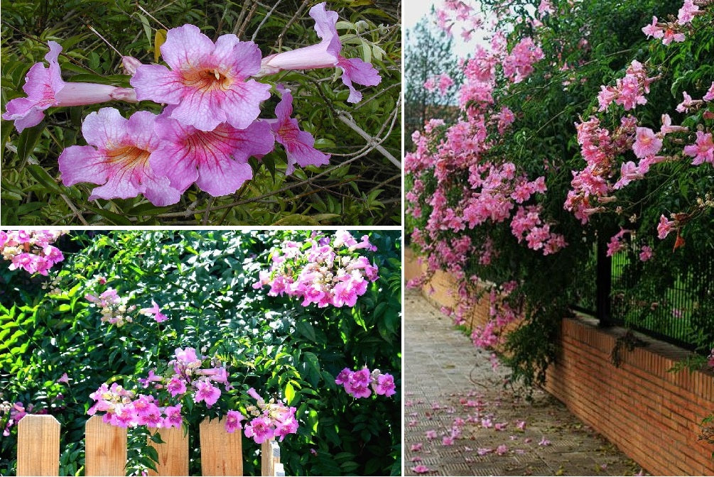 Pink trumpet vine is a vigorous climber known for its stunning blooms. It thrives in well-draining soil and requires full sun to flourish, making it relatively low maintenance.